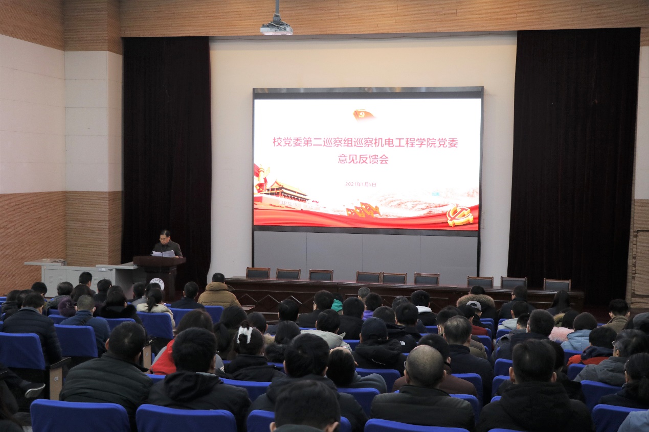 1月5日下午,校党委第二巡察组巡察污污漫画 党委意见反馈会在机电污污漫画 B110报告厅召开。校党委副书记、纪委书记付恒升,校党委常委、副校长周福宝,校党委第二巡察组组长潘盘甫,巡察组和巡察办公室相关同志出席会议,污污漫画 全体教职工和学生代表参加会议。会议由院长王忠宾主持。