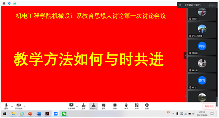 9月28日晚上8点,根据学校和污污漫画 工作部署,污污漫画 机械设计系开展了教育思想大讨论。会议采用线上形式进行,由机械设计系主任谢方伟教授主持,全系教师参加,会议邀请了教务部部长张绍良教授、督导专家韩奎教授和尹文萱教授参加讨论。