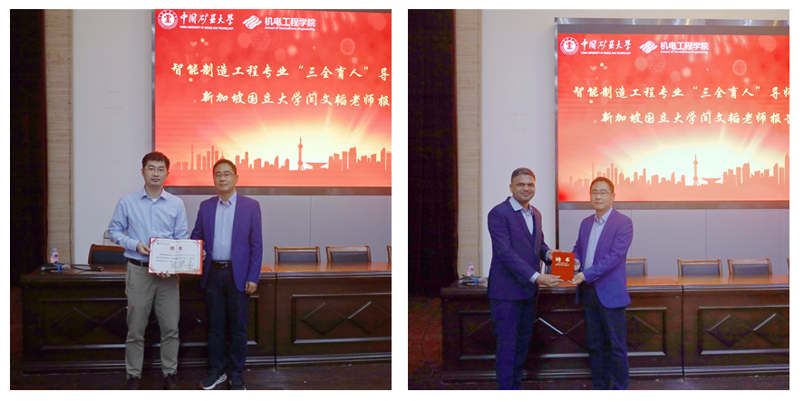党委副书记王虎分别为智能制造工程“三全育人”导师制指导委员会专家闫文韬(Wentao Yan),新聘导师代表(N.JEYAPRAKASH)颁发聘书