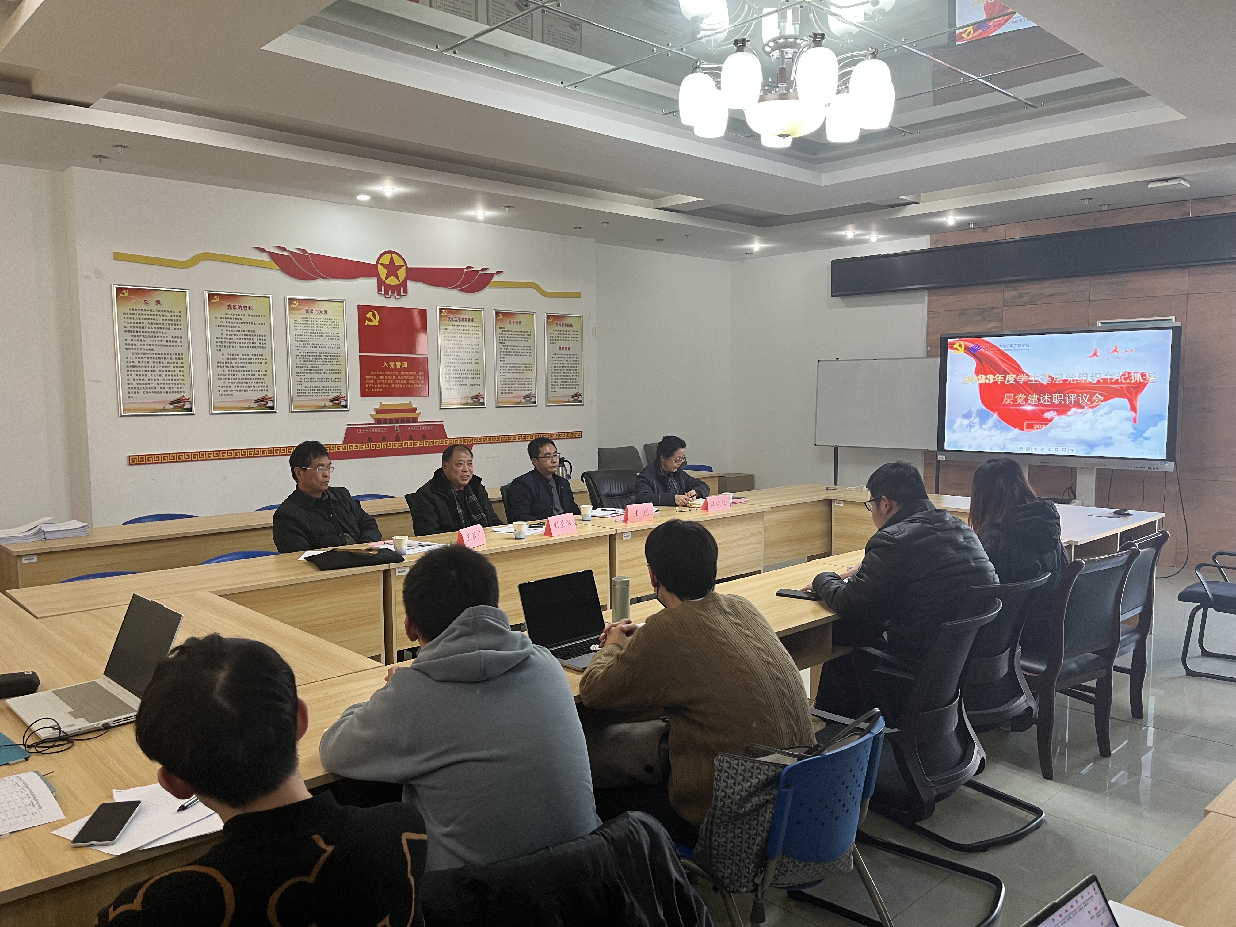 会上,博士、硕士研究生及本科生共计17名党支部书记依次进行述职,党支部书记围绕政治把关作用发挥、“七个有力”工作要求、发展党员工作、问题查摆整改情况等方面重点进行汇报。党委副书记王虎、关工委常务副主任刘圣汉、关工委副主任江晓红、关工委委员王启广分别对各党支部书记的述职情况进行了提问与点评。党委副书记王虎充分肯定了各学生党支部2023年工作取得的成绩,对2024年度的党支部工作和党员组织生活提出要求,希望各学生党支部认真落实“七个有力”工作要求,树立支部工作品牌,用心用情服务学生,切实帮助解决学生学习困难、生活困境和心理困惑。刘圣汉老师认为本科生支部的党员帮扶工作和研究生党支部量化工作均充分发挥了各学生党支部的战斗堡垒和先锋模范作用;江晓红老师从新媒体资源使用等角度对研究生支部们提出了支部工作个性化、特色化发展的建议;王启广老师希望各支部继续加强政治建设,提升基层党组织凝聚力、向心力和战斗力。