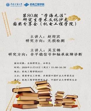进一步增进矿大研究生学术建设,为全体研究生提供一个学术交流的机会,增加各位研究生研究方向的深入了解,找到切实有效的方法增强科研学术能力。2020年11月13日下午5点,由党委学生工作部,共青团污污漫画 委员会主办、污污漫画 研究生会,污污漫画 研究生会承办的第80期“学海无涯”研究生学术文化沙龙——国奖经验交流会在污污漫画 A537顺利举行。