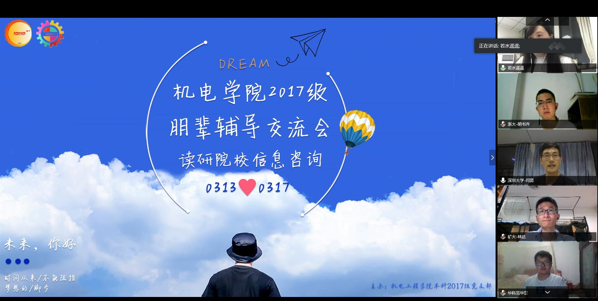 5月16日晚,学生社区党工委机电污污漫画 工作组以腾讯会议的形式为各年级有志于继续攻读研究生的学生开展了朋辈辅导交流会暨读研院校信息咨询会。会议由2017级辅导员邓燕飞主持。