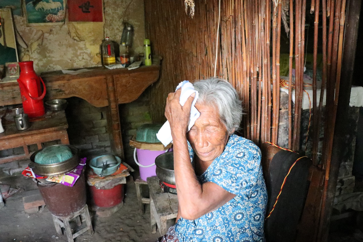 最令志愿者们印象深刻的是第三家。第三家本来应该和前两家差不多是小院子,但一大半的院子被倒塌的树枝树干盖住了,没被盖住的地方也长满了杂草,如果不是大门上挂着的锁,一定会被认定为是废弃的屋子。孩子的父亲几年前去世了,孩子的母亲因为某些原因离开了这个家庭生活,孩子一直和奶奶相依为命,靠着叔叔的接济和奶奶每个月仅仅200元的养老金过活。孩子很懂事,但学习成绩不好,或许是受到家庭因素的影响。孩子的奶奶今年已经八十多岁了,年纪大了,所幸身子还算硬朗,能简单地收拾收拾家务,做做饭。据志愿者们了解,孩子和奶奶基本每天都只能喝粥,吃不上新鲜的蔬菜,有好心人能拉一把的话生活还算过得去,但基本只能称得上“生存”。